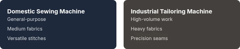 Domestic sewing machines fit most home projects; tailoring machines excel in professional, high-volume work