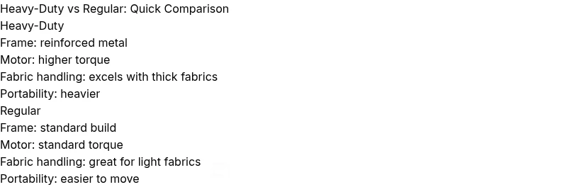 Heavy-duty machines are heavier and require sturdy tables and more stable mounting. If you have a small studio, a heavy machine might dominate your workspace; measure your bench height and ensure you have enough clearance around the throat area for bulky fabrics. Regular machines are more portable and easier to move between rooms or to classes. If your sewing area is shared or you travel to workshops, consider a mid-weight model with a solid warranty that balances performance and mobility.