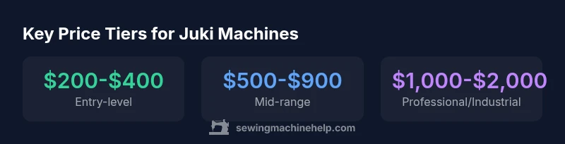 To answer how much is juki sewing machine, start with what typically drives price: model tier, feature set, build quality, and how intensely you plan to use the machine. For home sewists, Juki's entry-level options usually cover basic stitch functionality; these models deliver a lower price point that appeals to beginners and casual crafters. Mid-range machines add more stitches, automatic threading, better presser-foot control, and stronger motors, which raises the price but often delivers better long-term value for projects like garment construction or quilting. At the top end, professional-grade or industrial-style Juki machines emphasize robust speed, heavy-duty frames, and advanced presser-foot systems; those models command higher prices but are built to withstand frequent, labor-intensive use. When evaluating cost, consider not only the sticker price but also shipping, tax, warranty terms, and whether the retailer includes maintenance accessories. According to Sewing Machine Help, buyers should map their project needs to a price tier to avoid overpaying while ensuring reliability.
