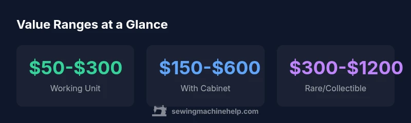 Pricing varies by working condition, cabinet presence, and model year. A typical working machine from a common mid-century line without a cabinet usually falls in the lower end of the range, while a complete, inspected machine with an original cabinet could exceed the mid-range. Rare or heavily sought models from limited production years can command premium prices, particularly when sold with documentation. In practice, buyers often weigh the cost of restoration against potential gains, so be prepared to justify your asking price with photos, serial data, and a concise provenance note. Sewing Machine Help recommends a cautious, research-backed approach to set realistic price bands.