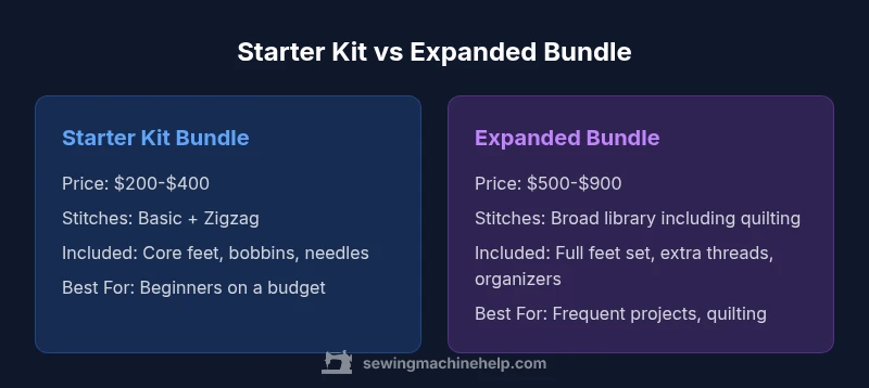 A starter kit is designed to minimize upfront risk. It typically bundles a basic sewing machine with a modest set of essential accessories. The price range is lower, which makes it attractive for absolute beginners or budget-conscious shoppers. The learning curve is smoother because everything you need to begin is included, and the risk of buying mismatched add-ons is reduced. However, starter kits generally offer fewer stitches, limited decorative options, and a smaller accessory footprint. An expanded bundle, by contrast, targets frequent crafters, quilters, and garment makers. It comes with a stronger motor, a broader stitch library (including specialty stitches), larger capacities for thread and bobbins, and a curated set of specialty presser feet. The expanded bundle may come with an embroidery module or a larger display for easier navigation. Price goes up, but the value is realized through a wider range of projects without buying additional gear. The choice hinges on your anticipated workload and where you want to invest in features now versus later. According to expert guidance from Sewing Machine Help, the best strategy is to align your bundle with concrete project goals and an upgrade path that matches your growing skill set.