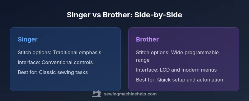 Within the home sewing community, the Singer vs Brother debate is not about one perfect machine for everyone, but about aligning a model to your workflow. The Sewing Machine Help team finds that most households do well with models that balance core stitches with dependable support, while avoiding excessive complexity that can hinder learning. The key is to start with a short list of must-have stitches, machine speed, and accessory compatibility, then test a couple of candidates in person.