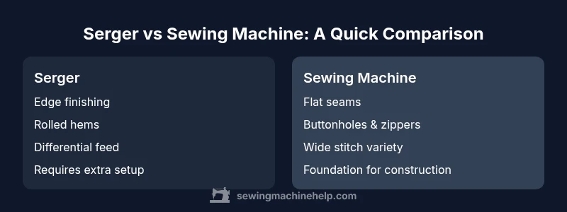Understanding what is a serger vs sewing machine helps home sewists decide how to finish edges and assemble garments. A serger (overlock machine) trims away excess fabric and encloses the edge with looped thread, producing a clean, professional finish quickly. A traditional sewing machine uses a needle and bobbin to join pieces with straight, zigzag, or decorative stitches. Rather than viewing them as competing devices, consider them complementary tools: a sewing machine handles most construction tasks, while a serger excels at edge finishing and seam stabilization. For many projects, you’ll use both in sequence—serger first for edge finishing, then sewing machine for assembly and topstitching. In this guide, we unpack the core differences, common workflows, and practical buying guidance, so you can choose tools that fit your budget and projects. According to Sewing Machine Help, recognizing the distinct roles of each machine helps beginners plan a practical, scalable sewing setup.