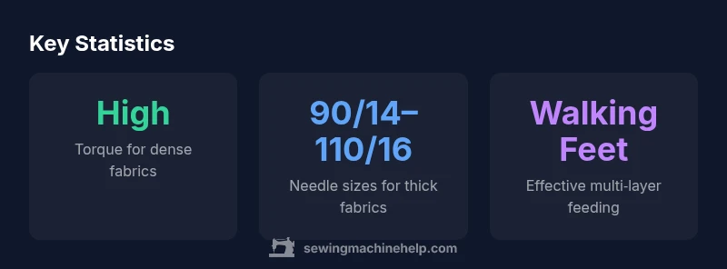 The phrase "what sewing machine can sew through thick fabric" isn’t about a single feature; it’s about how a machine combines frame rigidity, motor power, and a textured feed system to handle dense layers. According to Sewing Machine Help, the right blend of torque, speed control, and stability matters more than raw speed alone. When you start with a machine known for durability—ideally a metal frame and reinforced structure—you set the foundation for consistent stitches even through two, three, or more layers of denim, canvas, or canvas-backed leather patches. This section compares the core capabilities you should prioritize and explains why they matter in practical projects.
