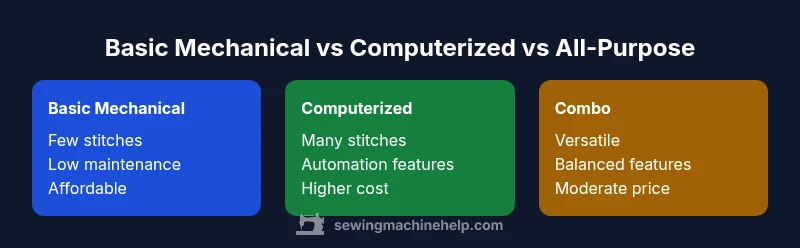 Sewing machines typically fall into three broad families: Basic Mechanical, Computerized/Servo, and All-Purpose/Combo machines. Each family targets different user needs and price bands. Basic Mechanical machines are known for reliability and straightforward operation; Computerized models offer a broad stitch library, automatic buttonholes, and more built-in conveniences; All-Purpose machines aim to balance versatility with accessibility. According to Sewing Machine Help analysis, most home sewists benefit from clarity about your primary projects and a realistic budget before choosing a family. This prevents overbuying features you won’t use and underbuying basics that keep you stitching.