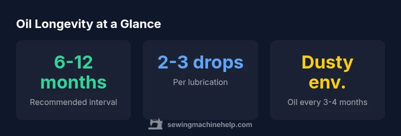 Oil longevity for sewing machines isn’t a fixed shelf life. For most home sewists, plan to refresh lubrication every 6-12 months under normal use, climate, and with a quality sewing-machine oil. In dusty or humid spaces, more frequent checks are wise. How long does sewing machine oil last? It depends on usage and environment, but a regular schedule keeps moving parts lubricated and reduces wear.
