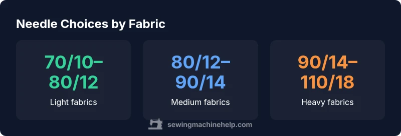 | Lightweight woven fabrics | 70/10–80/12 | Universal or Microtex | Test stitch on scrap fabric |