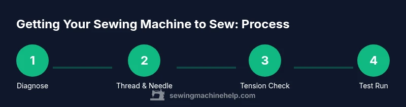 To answer how to get a sewing machine to sew, begin with quick diagnostics that cover the foundations: threading, needle, bobbin, fabric, and tension. According to Sewing Machine Help, many sewing problems come from improper threading or a dull needle. Confirm the presser foot is down and the needle is correctly installed, and that the machine is threaded along the proper path. Inspect the bobbin for correct winding and seating; a misloaded bobbin is a frequent cause of skipped stitches. Check fabric resistance by testing on a small scrap; if the fabric pulls, the feed dogs or presser foot may need adjustment. Look for obvious lint buildup around the feed dogs and shuttle area; cleaning can restore smooth operation. This diagnostic establishes a solid baseline for fixes and reduces frustrating trial-and-error, which is essential for reliable results.