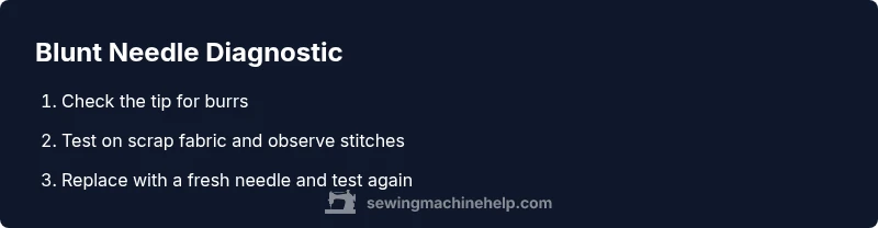 If you're asking how to tell if sewing machine needle is blunt, you're addressing a common cause of stitching problems. According to Sewing Machine Help, a blunt needle can silently damage fabric and create skipped stitches. The bluntness typically shows up long before the needle visibly breaks; the best tests look for changes in stitch formation, fabric snagging, and thread fraying. In practice, you’ll want a simple diagnostic routine that you can perform on scraps before you sew a garment or project. This article walks through practical checks, how to test safely, and how to replace the needle to restore clean, consistent stitches.