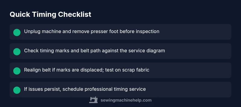- Power down, unplug, and remove the needle plate to access the timing area. 2) Locate the timing marks on the front or top cover and note their positions relative to the belt and crank. 3) If marks are displaced, gently reseat the timing belt and recheck alignment with the factory diagram. 4) Reassemble the cover, reinstall the needle and bobbin, then run a slow test on scrap fabric. 5) If stitches improve but remain imperfect, adjust in small increments or replace the belt as needed. 6) Re-test under light, then normal sewing speed; if issues persist, seek professional service. Tip: take clear photos before disassembly so you can recreate the exact alignment.
