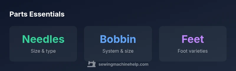 Parts are often grouped by the function they perform. Key categories include needles and needle systems (size, type, and compatibility with fabric and stitch type), bobbins and bobbin cases (material and size variations by model), presser feet (for different stitches and fabrics), needle plates and feed dogs (guide fabric and thread path), and drive belts or gear assemblies (drive motion). Each category has subtypes that affect performance. Understanding how these parts interact helps you diagnose issues more accurately and select replacements that restore original performance. For example, mismatched needle type or foot can alter stitch tension and fabric feed, while a worn bobbin case can cause thread bunching. In practice, inspect the relevant subsystem when troubleshooting rather than replacing multiple parts at once.