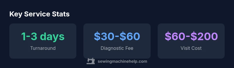 Common sewing machine services fall into tune-ups, timing and drive belt adjustments, cleaning and lubrication, motor or gear repairs, and electronics-related fault fixes. A typical tune-up may involve cleaning, oiling, tension adjustment, and stitch testing; this is often the most cost-effective entry point for local service. Timing issues, drive belt replacements, and gear issues tend to fall on the higher end of the spectrum and may require parts. Diagnostic fees cover the initial assessment and can be credited toward the final bill if you proceed with repairs. When you search for sewing machine service near me, expect the diagnostic fee in the range of $30-$60, with labor and parts potentially adding $60-$200 per visit, depending on machine complexity and parts availability. If your machine is a higher-end model or requires specialized parts, the total could be outside that range, but most reputable local shops provide a detailed written quote before any work begins. Always factor in potential travel charges if the technician visits your home. According to Sewing Machine Help Analysis, 2026, price transparency and itemized estimates are strong indicators of trustworthy service.