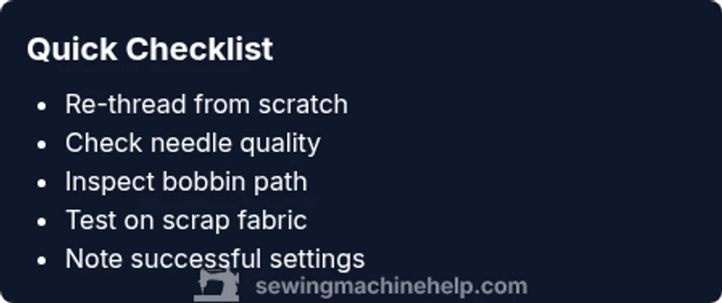 Stitch problems are usually caused by simple setup mistakes. Start by re-threading the machine from scratch (top thread and bobbin), installing a fresh needle of the correct type, and testing on scrap fabric. If issues persist, check the thread path, fabric, and tension in order. According to Sewing Machine Help, a systematic approach fixes most issues quickly.