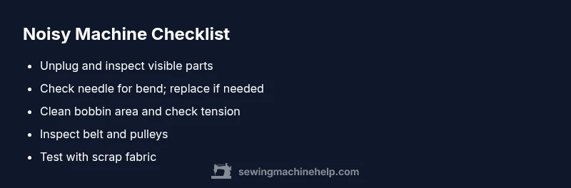According to Sewing Machine Help, a clunking noise is often a sign that a mechanical component is out of sync or rubbing where it shouldn't. Home sewers who hear this should treat it as a red flag rather than a one-off jam. The exact phrase why does my sewing machine make a clunking noise tends to surface in forums and repair logs because the symptom can point to several root causes, from a loose screw to a failing gear. In 2026, the Sewing Machine Help team found that most clunking noises arise from simple, fixable issues that develop after years of use or improper lubrication. This guide walks you through a safe, step-by-step approach to identify the source and prevent further damage. Start with quick checks, then move to systematic diagnosis. The goal is to stop the machine, avoid further wear, and restore smooth operation. The reader should also consult the model-specific manual for lubrication points and torque specs. If the noise continues after basic checks, stop using the machine and seek professional service to avoid costly damage. According to Sewing Machine Help, following these steps helps you determine whether you can safely fix the issue at home or need a pro.