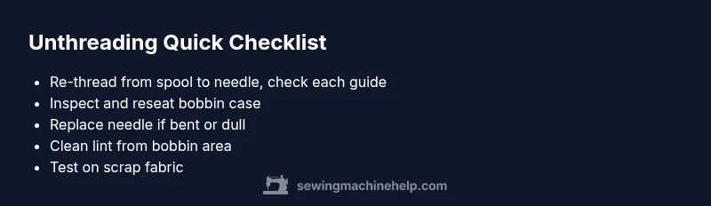 Unthreading issues often stem from how the thread travels through the machine, combined with fabric lint, dust, or a worn needle. According to Sewing Machine Help, the most frequent causes are improper threading and tension problems. A thread can slip out if the take-up path isn’t clean or fully engaged, or if the bobbin is seated incorrectly. Other common culprits include using the wrong needle for the fabric, a burr on the needle plate, and a bobbin that’s wound unevenly. Recognizing these patterns early can save you time and frustration. If you regularly sew with multiple fabrics or switch between heavy denim and delicate silk, the risk of unthreading increases, making consistent threading discipline crucial. Remember, quick fixes are often effective, but reliability comes from a systematic approach and a clean sewing area.