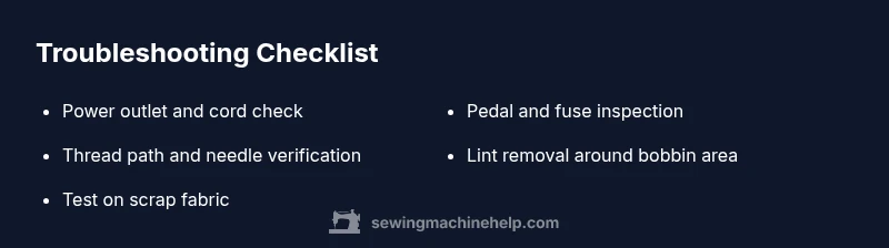 If your sewing machine won't start, the most common cause is a power issue or loose connection. First, verify the outlet works by testing another device, and inspect the power cord and foot pedal for damage. Confirm the machine’s switch is on and any fuses are intact. Unplug before testing, and follow model-specific safety steps from the manual. If these checks don’t resolve it, proceed with the diagnostic flow in the body for deeper issues.